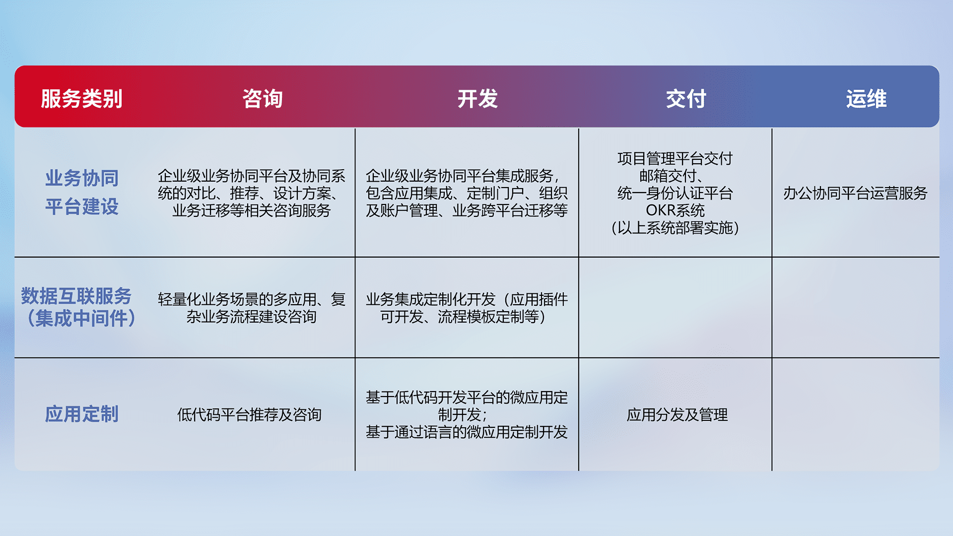 针对钉钉、、、、企微、、、、IDaas等平台级产品提供产品的规划、、、、方案、、、、交付、、、定制化开发等服务,,实现如统一协同办公、、智能客户服务、、、混合会议管理、、、、智能数据查询、、、等业务场景,,,,实现数字化转型。。。